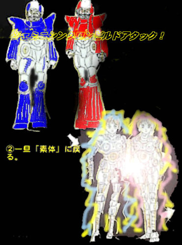合体した素体はコアのエネルギーで巨大化し、それを左右から新しい外装が挟みこむ