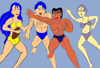 兄の鉄平、恋人の信彦、親友の四葉とビーチフットボールで汗を流す宏美 |