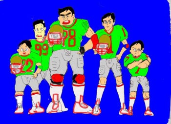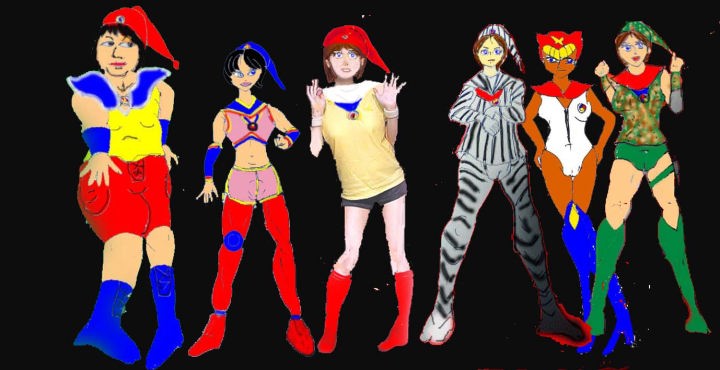 リミットちゃんに取って代わろうとする、右からリミットちゃんビッグボディ(モデル・山崎静代)、リミットちゃんスーパーフェニックス(モデル・上戸彩)、(本物のリミットちゃん・モデル・長澤まさみ)、リミットちゃんゼブラ(モデル・吉澤ひとみ)、リミットちゃんマリポーサ(モデル・後藤真希)、リミットちゃん・ソルジャー(モデル・内田有紀) |