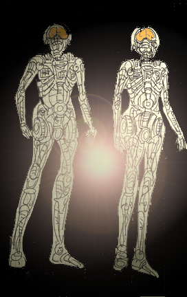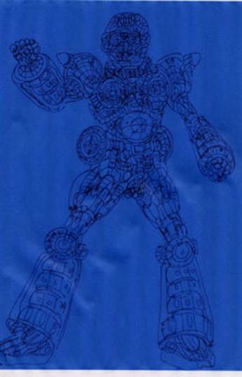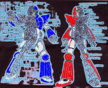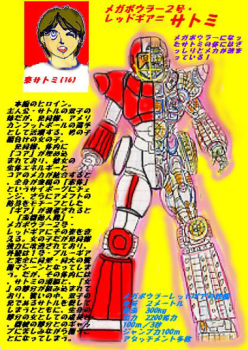 もしくは生命に危険が迫るとコアが作動し、中に入っている金属細胞が生体細胞と融合または置き換えられ、脳と生殖腺(生体エネルギーを最も出すので必要)以外は全てメカのサイボーグ・「素体」にチェンジする。顔の部分だけは変身してすぐに人工皮膚と頭髪により覆われ元の顔に戻る。この状態でギアと合体し、メガボウラーになるのだ。 |