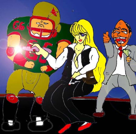 吉本工業の横山監督とともに、悪企みをする麗菜。レーザーポインターで審判の目をくらましているところ。 |