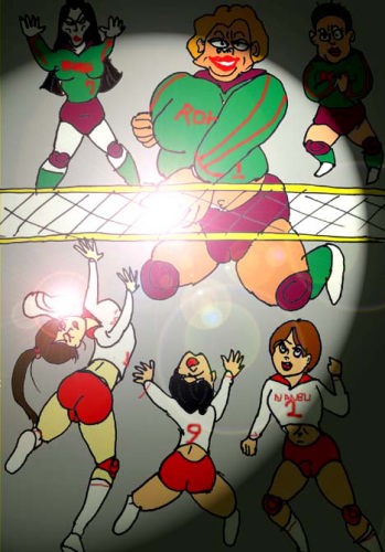 さて西本の思いとは無関係に試合は始まった。幸いにも先攻は南武。由美とサトミの即席コンビの活躍でまずは10-0と絶好調。しかしふとしたミスからサービス権を奪われてしまうと、まだ他の選手のスパイクなら大丈夫だが・・ついに多々良が前衛に回ってきてしまった。そしてその強烈なアタックは・・・間違いなく由美を狙っている。しかも、はじめから中てるつもりだ。由美はバレーを始めて初めてボールに恐怖を感じた。屈辱的なできごとだった。「無敵赤ブルマのお由美」がはじめてボールから逃げたのだ。次も寸部たがわず由美に。しかし由美を突き飛ばしてこれを受け止めた者がいた。われらのサトミだ。レシーブしたとき骨が砕けたのではと思う激痛が走る。しかし何とかこれを上にクリアするとわれにかえった由美がすかさず打ち返し、サービス権を奪取した。そして南武校はタイムをとった。