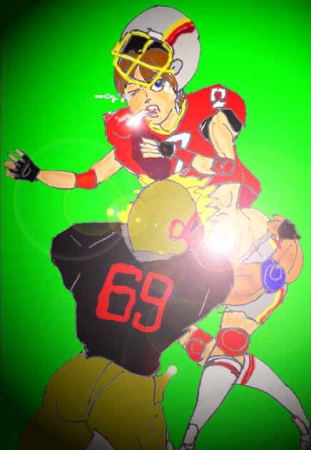 手を伸ばしインターセプトしようとする吉本の三郎と四郎の手をすり抜け、パスがサトミに通った!と同時に、サトルは西山に激突された。パスを投げた後のQBへのタックルは反則だが、微妙な瞬間。審判の笛は鳴らなかった。西山はどさくさにまぎれて、肘鉄を喰らわして来た。「ウッ!」一瞬苦しむサトルだったが、鍛えぬかれた腹筋により、内蔵の破壊は免れた。しかし、サトルは自分のことより、気になることがあったのだ。