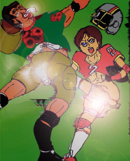 ボールを持ち突進するサトミに、一旦は西山のタックルが決まった。西山のヘルメットは、サトミの鳩尾に食い込み、その手はパンツを掴み、ずり降ろした形となった。普通なら、ここでやられたほうは失神するだろう。だが、なんと胃液を吐きながらもこの激痛に耐えたサトミは、ボールを放さず、西山の股間に思い切り蹴りを入れたのだ!本来なら、両者とも悪質な反則であるのだが、一瞬の出来事に、単にサトミが西山の、2倍(サトミ60キロ、西山110キロ)の体重を跳ね除け、突破したようにしか見えなかったのだ。では何故審判は・・・。