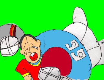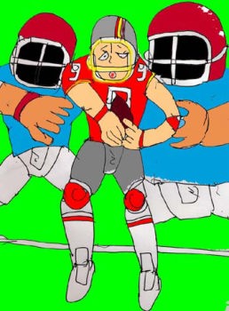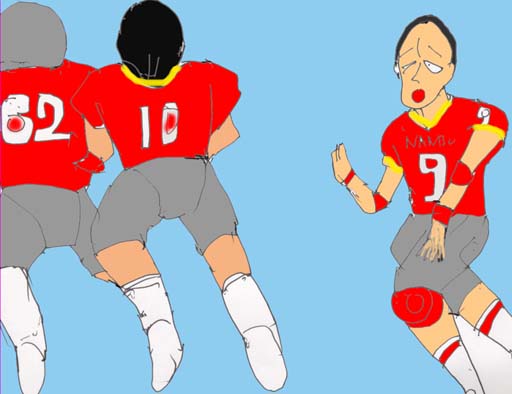 あわててオサムを追う敵。オサムは速かった。だが、息切れも速い。あっというまに減速してしまうオサム。エンドゾーンはあと僅かなのに・・・。巨漢の田端と藤本が迫る・・。そして、藤本の巨体が、オサムを押し倒したのと、オサムがエンドゾーンを越えたのは・・・
