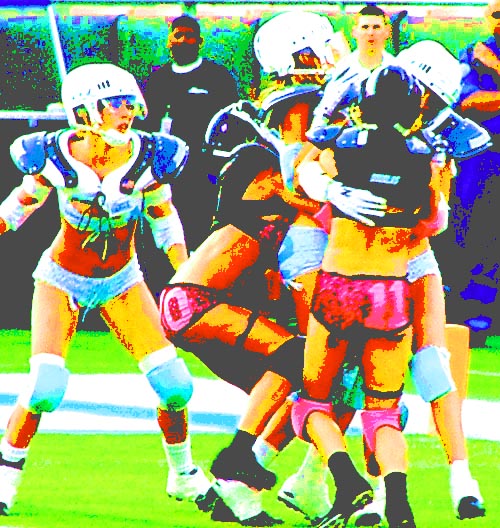 なんと、そこには半裸の女性が防具だけをつけて(他には乳房と股間を最小限隠すエッチな下着だけ)ガンガンぶつかり合ってアメフトの試合をしている姿が映し出されていた。