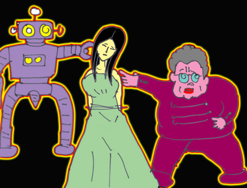 そこには、醜く太ったメガネの男と、ロボット怪人が!そして若い女の人が捕らえられていた。