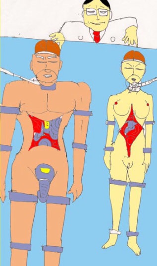 敵との戦いでダメージを受けて、細川博士に修理される香織 |
