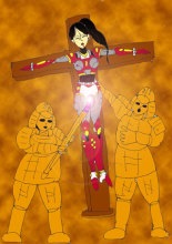 さすがの香織も、ハニワ武人2人係の2人かかりの攻撃についに力尽き、磔に・・・。隼人よ、助けるんだ! |