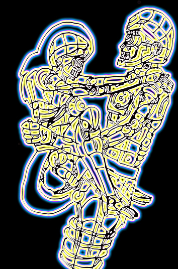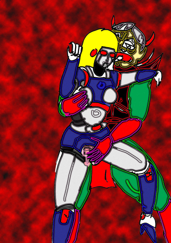 そして二人は激しく交わると真っ赤な火の玉になり、巨大化して、中からインビンシブル・ポリスという巨大サイボーグが現れた。そして他の3人を手に乗せると胸のハッチに乗せ、中に乗せた。