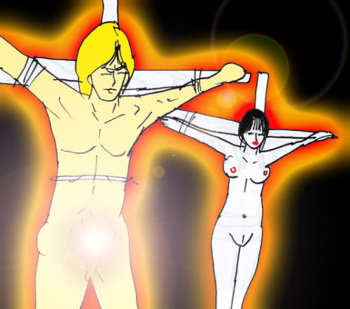 十字架に架けられ、グロパレスの神殿に運ばれる二人・・・。
