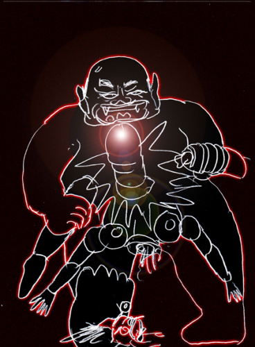 「おや、これはワシの大好物の脳みそじゃないか。サイボーグなので少し油くさいが、最近食ってなかったから我慢するか。ガッハッハ」グロムウエルは、リズの破壊された頭部から脳を取り出し、食べてしまった。