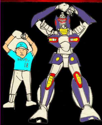 「バルディ・チャージ!」2人は変身、続いて合体、変形してバルディスターになり、垂直に成層圏に飛び出し、角度をつけて甲子園に落下した。この方法だと、鎌倉と甲子園はわずか15分で到達するのだ。