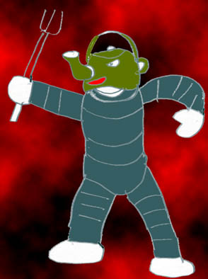 「生意気なガキどもめ!捻り潰してやる。その前に俺様の名前を教えてやろう。俺様は怪人鉄瓶マスク様だ!