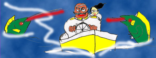 「ガッハッハ・・」水しぶきを上げて突進するボート。実は少将は海軍の端艇競争25年連続優勝の実力の持主なのだ。