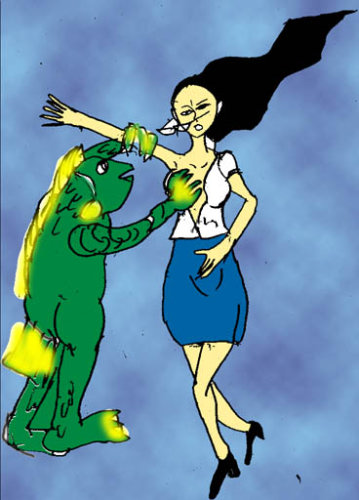 なんと、半漁人が先生のブラウスを破り襲っている。