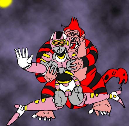 猿に似ているがはるかに巨大で、赤と黒の縞模様の体に不気味な唸り声を上げて二人を襲う獣人・・・。尻尾は蛇になっていて自在に攻撃してくる。
