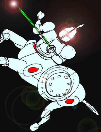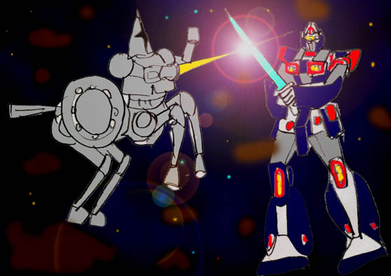 2体の巨大戦士は、宇宙の岩場に隠れ、また踏み台にしながら剣を交える。