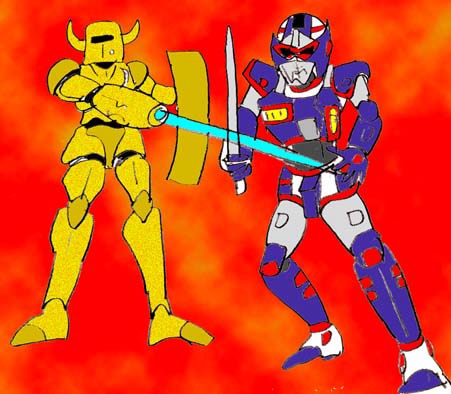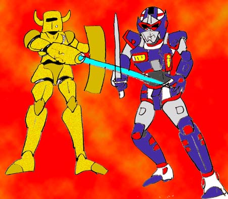 ゴールドナイトの甲冑は堅く、隼人の何でも切れるはずのバルディソードもよほど芯で突かない限り貫けない。また彼のビーム剣は、かなりの高周波で、隼人と言えども急所を突かれれば機能を損ねてしまう。2人の一騎打ちは一進一退であった。