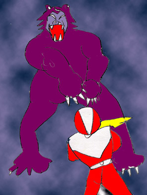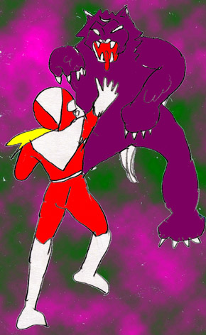 「出たな化け物!」レッド(永田)は変身して立ち向かうがその腕力はすさまじく歯が立たない。