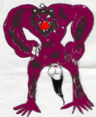 なんと、女が逆立ちしたと思うと、股間から熊の顔が現れ、見る見る全身が剛毛に覆われ、元の髪の毛が尻尾になって熊の怪物に姿を変えた。
