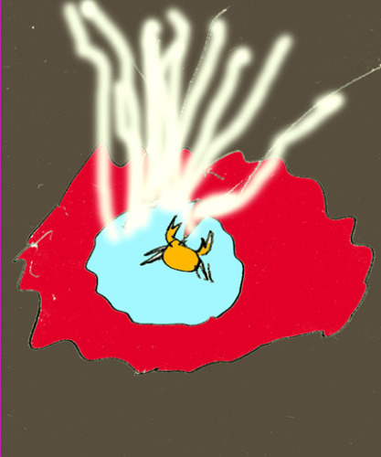 バルディスターは、蟹の鋏を掴んで熱湯の池にぶち込む。するとどうだろう・・・真っ赤に茹で上がってしまった。だが、地球の蟹と違い生きている。
