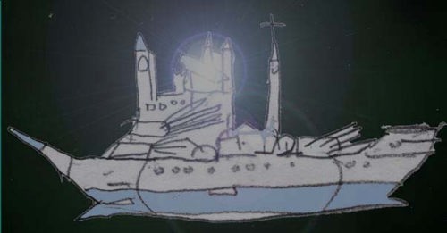 「お、親分!10時の方向に敵影・・・・。尖塔が4つ・・・!オオ、天佑だ!あれは、あれは・・・!」