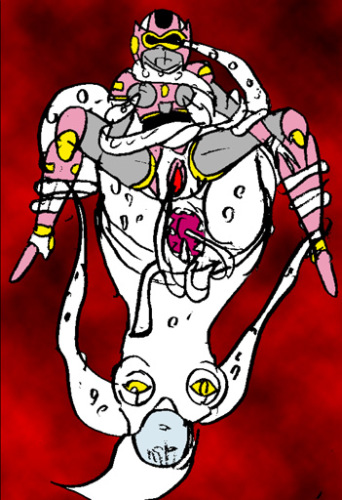とんび、別名カラス口とも言うイカの嘴。この怪獣のそれは、まるで女性のクリトリスのようであった・・・を隼人の剣が突き刺す。