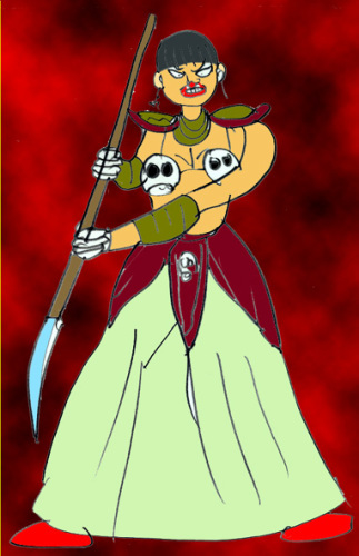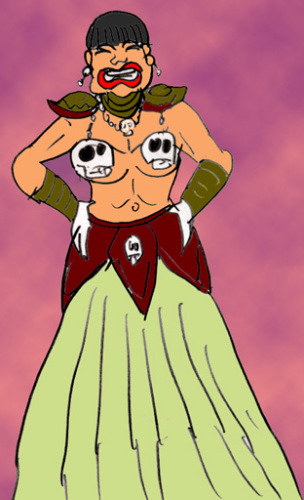 短く切りそろえられた黒髪、鍛え上げられた肉体は2メートル近くあり、薄緑の絹のロングスカートの上に漆と金の鎧を付け、上半身は髑髏で乳房を隠し肩当をつけていた。
