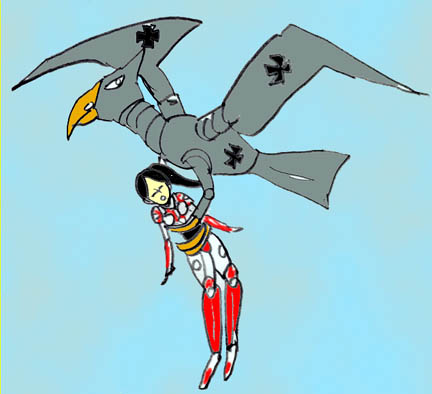 細川博士の数少ないライバルの1人、独逸のアーデルブルク博士が、陸戦用巨大ロボと、それを空から支援し、また合体することによって飛行能力を与えるメカ怪鳥を完成させたのだ。