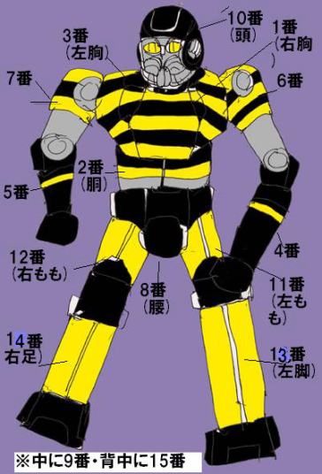 11・12番が太ももに、13・14番が脚に、そして15番が背中に張りつき、体を丸めた10番が頭に変形して、合体巨人ビッグラガーになった。