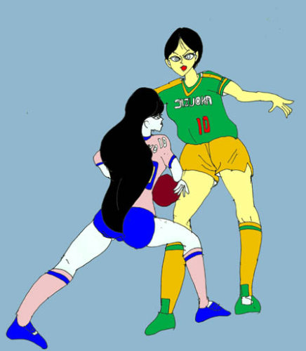 中学時代、バスケットボールでのライバルだった香織と麻里子(当時の名前は加藤真理)。ボーイッシュに鍛えられた香織に対し、女性らしい白い肌と黒髪を持ち、かつチームメートに恵まれた真理に対し香織は激しいライバル意識を燃やす。(注・色白で長い髪ですが由香ではありません。なお、由香の肌は僅かに色を乗せていますがマリコは白を使用しています) |